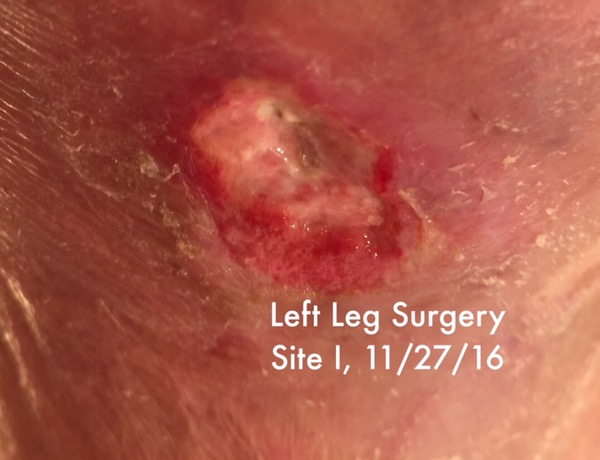 The veins effected are on the inside calf of both my legs, three on my left leg and two on the right leg. I have been told that the valves are failing due to the above mentioned accident which affected the nerves which help with the blood pressure in my legs which helps pump the blood to and back up from my lower body. Of the four surgery sites, two of them became infected and the 9/2016 site is one of them. The sites were about 1/4″ to 1/2″ in size after surgery and once infected grew to 3-1/2″ by 4-1/4″ and 1/8″ -3/8″ deep.