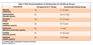 Recommendations on drug choice, concentration limits, and starting doses were outlined by the Polyanalgesic Consensus Conference (PACC) latest reiteration in 2012.14 A panel of experts on behalf of the International Neuromodulation Society (INS) convened on intrathecal therapy to promote safety and efficacy. The medication tiers were designed based on nociceptive or neuropathic pain (see Tables 2-4).