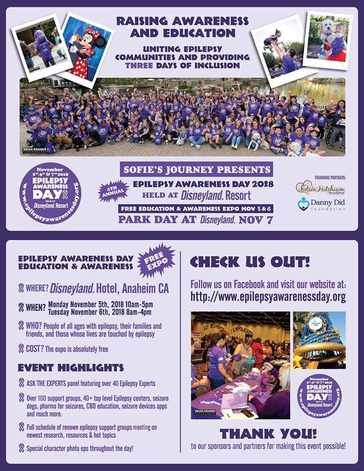 Mark your calendars for this years, Epilepsy Awareness Day Disneyland event to be held November 5th, 6th and 7th. If you have never been just go to their website at, http://www.epilepsyawarenessday.org for more details.