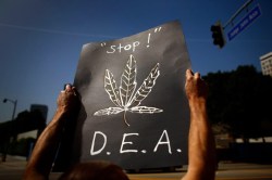 A protestor holds a sign that says “Stop!,” along with a drawn marijuana leaf and the initials “D.E.A.” Supporters of medical marijuana use and distribution gathered to protest recent raids and closures of stores by the Drug Enforcement Agency (DEA),
